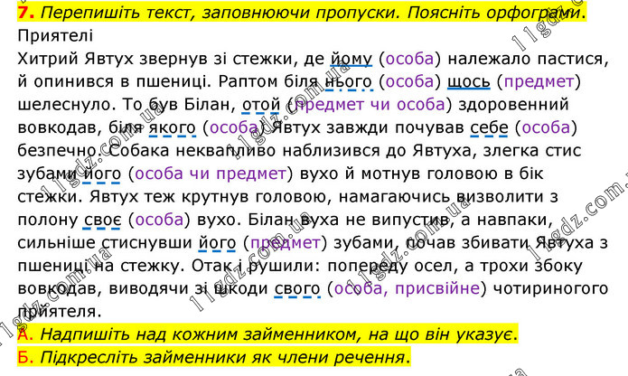 Перепишіть текст, заповнюючи пропуски. Поясніть орфограми. Приятелі Хитрий Явтух звернув зі стежки, де йому (особа) належало пастися, й опинився в пшениці. Раптом біля нього (особа) щось (предмет) шелеснуло. То був Білан, отой (предмет чи особа) здоровенний вовкодав, біля якого (особа) Явтух завжди почував себе (особа) безпечно. Собака неквапливо наблизився до Явтуха, злегка стис зубами його (особа чи предмет) вухо й мотнув головою в бік стежки. Явтух теж крутнув головою, намагаючись визволити з полону своє (особа) вухо. Білан вуха не випустив, а навпаки, сильніше стиснувши його (предмет) зубами, почав збивати Явтуха з пшениці на стежку. Отак і рушили: попереду осел, а трохи збоку вовкодав, виводячи зі шкоди свого (особа, присвійне) чотириногого прйятеля. А. Надпишіть над кожним займенником, на що він указує. Б. Підкресліть займенники як члени речення.