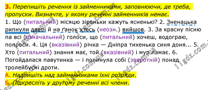 Перепишіть речення із займенниками, заповнюючи, де треба, пропуски. Визначте, у якому реченні займенників немає. 1. Що (питальний) місяцю зіроньки кажуть ясненькі? 2. Зненацька рипнули двері й на ґанок хтось (неозн.) вийшов. 3. За красну пісню па всі (означальний) голоси, що (питальний) хочеш, водограю, попроси. 4. Ця (вказівний) річка — Дніпра тихенька синя доня... 5. Хто (питальний) знання має, той (вказівний) і мур ламає. 6. Погойдалася павутинка — і полинула собі (зворотній) понад тролейбусні дроти. А. Надпишіть над займенниками їхні розряди. Б. Підкресліть у другому реченні всі члени.