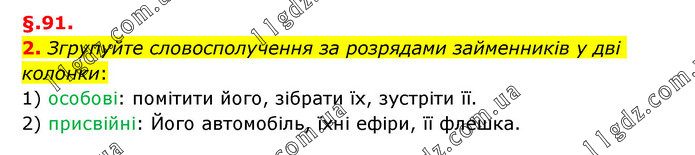 §.91. 2. Згрупуйте словосполучення за розрядами займенників у дві колонки: 1) особові: помітити його, зібрати їх, зустріти її. 2) присвійні: Його автомобіль, їхні ефіри, її флешка.