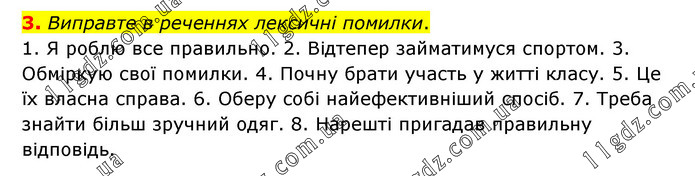 Виправте в реченнях лексичні помилки. 1. Я роблю все правильно. 2. Відтепер займатимуся спортом. 3. Обміркую свої помилки. 4. Почну брати участь у житті класу. 5. Це їх власна справа. 6. Оберу собі найефективніший спосіб. 7. Треба знайти більш зручний одяг. 8. Нарешті пригадав правильну відповідь.