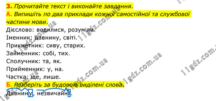 Прочитайте текст і виконайте завдання. А. Випишіть по два приклади кожної самостійної та службової частини мови. Дієслово: водилися, розуміли. Іменник: давнину, світі. Прикметник: сиву, старих. Займенник: собі, тих. Сполучник: та, як. Прийменник: у, на. Частка: ще, лише. Б. Розберіть за будовою виділені слова. Давнину, незвичайні.