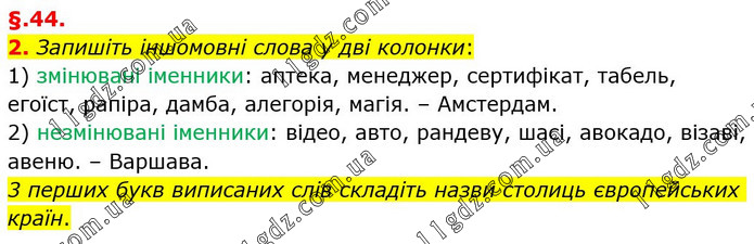 §.44. 2. Запишіть іншомовні слова у дві колонки: 1) змінювані іменники: аптека, менеджер, сертифікат, табель, егоїст, рапіра, дамба, алегорія, магія. – Амстердам. 2) незмінювані іменники: відео, авто, рандеву, шасі, авокадо, візаві, авеню. – Варшава. 3 перших букв виписаних слів складіть назви столиць європейських країн.