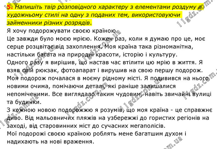 Напишіть твір розповідного характеру з елементами роздуму в художньому стилі на одну з поданих тем, використовуючи займенники різних розрядів. Я хочу подорожувати своєю країною. Це завжди було моєю мрією. Кожен раз, коли я думаю про це, моє серце розцвітає від захоплення. Моя країна така різноманітна, настільки багата на природні красоти, історію і культуру. Одного разу я вирішив, що настав час втілити цю мрію в життя. Я взяв свій рюкзак, фотоапарат і вирушив на свою першу подорож. Моя подорож почалася в моєму рідному місті. Я подивився на нього новими очима, помічаючи деталі, які раніше залишалися непоміченими. Все виглядало таким чудовим, навіть звичайні вулиці та будинки. З кожною новою подорожжю я розумів, що моя країна - це справжнє диво. Від мальовничих пляжів на узбережжі до гористих регіонів на заході, від старовинних міст до сучасних мегаполісів. Мої подорожі своєю країною роблять мене багатшим духом і надихають на нові враження.