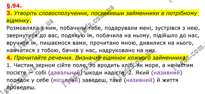 §.94. 3. Утворіть словосполучення, поставивши займенники в потрібному відмінку. Розмовляла з ним, побачили тебе, подарували мені, зустрівся з нею, звернутися до вас, подякую їм, побачила на ньому, підійшло до нас, вручити їм, пишаємося вами, прочитано мною, дивилися на нього, навчатися з тобою, бачив у нас, надруковано на них. 4. Прочитайте речення. Визначте відмінок кожного займенника. 1. Чистим зерном сійте поле, то вродить хліб, як море, а нечистим посієте — собі (давальний) шкоди надієте. 2. Який (називний) порядок у себе (місцевий) заведеш, таке (називний) й життя проведеш.
