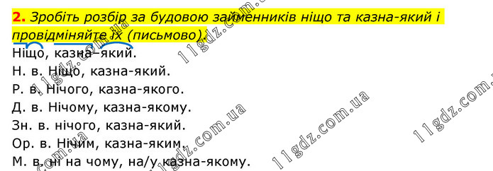 Зробіть розбір за будовою займенників ніщо та казна-який і провідміняйте їх (письмово). Ніщо, казна–який. Н. в. Ніщо, казна-який. Р. в. Нічого, казна-якого. Д. в. Нічому, казна-якому. Зн. в. нічого, казна-який. Ор. в. Нічим, казна-яким. М. в. ні на чому, на/у казна-якому.