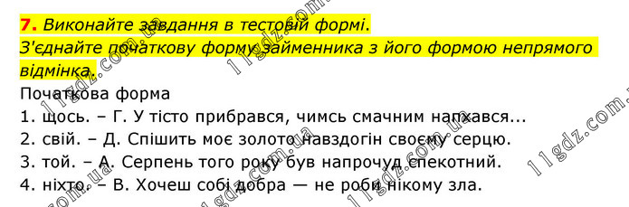 Виконайте завдання в тестовій формі. З'єднайте початкову форму займенника з його формою непрямого відмінка. Початкова форма 1. щось. – Г. У тісто прибрався, чимсь смачним напхався... 2. свій. – Д. Спішить моє золото навздогін своєму серцю. 3. той. – А. Серпень того року був напрочуд спекотний. 4. ніхто. – В. Хочеш собі добра — не роби нікому зла.