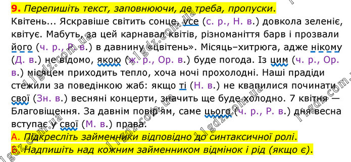 Перепишіть текст, заповнюючи, де треба, пропуски. Квітень... Яскравіше світить сонце, усе (с. р., Н. в.) довкола зеленіє, квітує. Мабуть, за цей карнавал квітів, різноманіття барв і прозвали його (ч. р., Р. в.) в давнину «цвітень». Місяць–хитрюга, адже нікому (Д. в.) не відомо, якою (ж. р., Ор. в.) буде погода. Із цим (ч. р., Ор. в.) місяцем приходить тепло, хоча ночі прохолодні. Наші прадіди стежили за поведінкою жаб: якщо ті (Н. в.) не квапилися починати свої (Зн. в.) весняні концерти, значить ще буде холодно. 7 квітня — Благовіщення. За давнім повір'ям, саме цього (ч. р., Р. в.) дня весна вступає у свої (М. в.) права. А. Підкресліть займенники відповідно до синтаксичної ролі. Б. Надпишіть над кожним займенником відмінок і рід (якщо є).