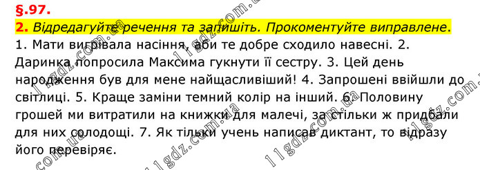 §.97. 2. Відредагуйте речення та запишіть. Прокоментуйте виправлене. 1. Мати вигрівала насіння, аби те добре сходило навесні. 2. Даринка попросила Максима гукнути її сестру. 3. Цей день народження був для мене найщасливіший! 4. Запрошені ввійшли до світлиці. 5. Краще заміни темний колір на інший. 6. Половину грошей ми витратили на книжки для малечі, за стільки ж придбали для них солодощі. 7. Як тільки учень написав диктант, то відразу його перевіряє.