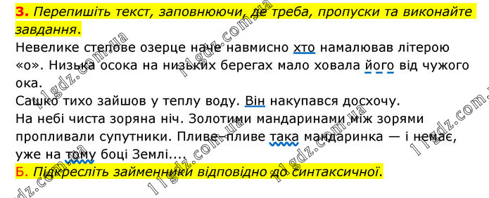 Перепишіть текст, заповнюючи, де треба, пропуски та виконайте завдання. Невелике степове озерце наче навмисно хто намалював літерою «о». Низька осока на низьких берегах мало ховала його від чужого ока. Сашко тихо зайшов у теплу воду. Він накупався досхочу. На небі чиста зоряна ніч. Золотими мандаринами між зорями пропливали супутники. Пливе–пливе така мандаринка — і немає, уже на тому боці Землі.... Б. Підкресліть займенники відповідно до синтаксичної.