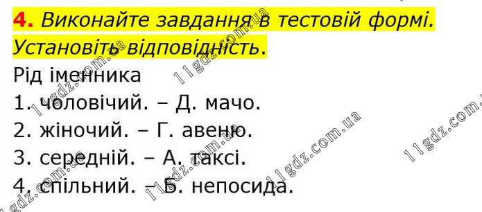 Виконайте завдання в тестовій формі. Установіть відповідність. Рід іменника 1. чоловічий. – Д. мачо. 2. жіночий. – Г. авеню. 3. середній. – А. таксі. 4. спільний. – Б. непосида.