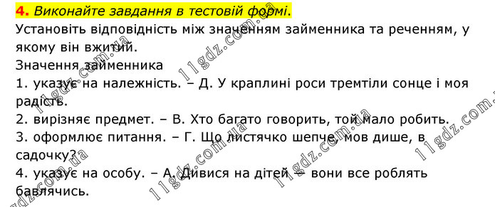 Виконайте завдання в тестовій формі. Установіть відповідність між значенням займенника та реченням, у якому він вжитий. Значення займенника 1. указує на належність. – Д. У краплині роси тремтіли сонце і моя радість. 2. вирізняє предмет. – В. Хто багато говорить, той мало робить. 3. оформлює питання. – Г. Що листячко шепче, мов дише, в садочку? 4. указує на особу. – А. Дивися на дітей — вони все роблять бавлячись.