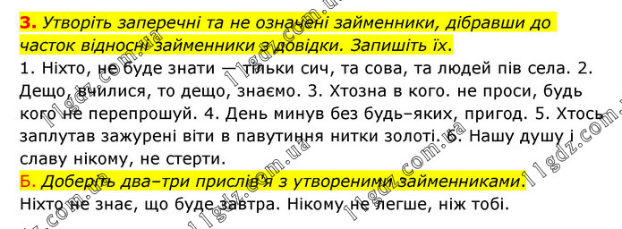 Утворіть заперечні та не означені займенники, дібравши до часток відносні займенники з довідки. Запишіть їх. 1. Ніхто, не буде знати — тільки сич, та сова, та людей пів села. 2. Дещо, вчилися, то дещо, знаємо. 3. Хтозна в кого. не проси, будь кого не перепрошуй. 4. День минув без будь–яких, пригод. 5. Хтось заплутав зажурені віти в павутиння нитки золоті. 6. Нашу душу і славу нікому, не стерти. Б. Доберіть два–три прислів'я з утвореними займенниками. Ніхто не знає, що буде завтра. Нікому не легше, ніж тобі.