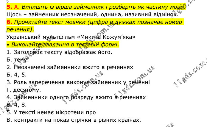 5. А. Випишіть із вірша займенник і розберіть як частину мови. Щось – займенник неозначений, однина, називний відмінок. 6. Прочитайте текст мовчки (цифра в дужках позначає номер речення). Український мультфільм «Микита Кожум’яка» • Виконайте завдання в тестовій формі. 1. Заголовок тексту відображає його. Б. тему. 2. Неозначені займенники вжито в реченнях Б. 4, 5. 3. Роль заперечення виконує займенник у реченні Г. десятому. 4. Займенники одного розряду вжито в реченнях В. 4, 8. 5. У тексті немає мікротеми про В. контракти на показ стрічки в різних країнах.