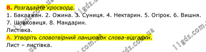 Розгадайте кросворд. 1. Баклажан. 2. Ожина. 3. Суниця. 4. Нектарин. 5. Огірок. 6. Вишня. 7. Шовковиця. 8. Мандарин. Листівка. А. Утворіть словотвірний ланцюжок слова-відгадки. Лист – листівка.