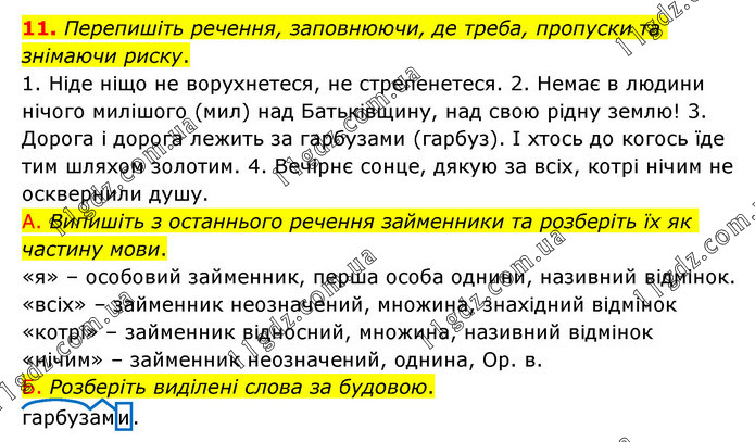 Перепишіть речення, заповнюючи, де треба, пропуски та знімаючи риску. 1. Ніде ніщо не ворухнетеся, не стрепенетеся. 2. Немає в людини нічого милішого (мил) над Батьківщину, над свою рідну землю! 3. Дорога і дорога лежить за гарбузами (гарбуз). І хтось до когось їде тим шляхом золотим. 4. Вечірнє сонце, дякую за всіх, котрі нічим не осквернили душу. А. Випишіть з останнього речення займенники та розберіть їх як частину мови. «я» – особовий займенник, перша особа однини, називний відмінок. «всіх» – займенник неозначений, множина, знахідний відмінок «котрі» – займенник відносний, множина, називний відмінок «нічим» – займенник неозначений, однина, Ор. в. Б. Розберіть виділені слова за будовою. гарбузами.