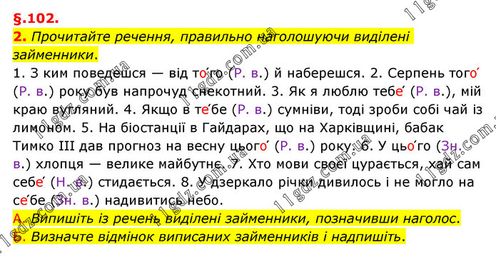 §.102. 2. Прочитайте речення, правильно наголошуючи виділені займенники. 1. З ким поведешся — від то՛го (Р. в.) й наберешся. 2. Серпень того՛ (Р. в.) року був напрочуд снекотний. 3. Як я люблю тебе՛ (Р. в.), мій краю вугляний. 4. Якщо в те՛бе (Р. в.) сумніви, тоді зроби собі чай із лимоном. 5. На біостанції в Гайдарах, що на Харківщині, бабак Тимко ІІІ дав прогноз на весну цього՛ (Р. в.) року. 6. У цьо՛го (Зн. в.) хлопця — велике майбутнє. 7. Хто мови своєї цурається, хай сам себе՛ (Н. в.) стидається. 8. У дзеркало річки дивилось і не могло на се՛бе (Зн. в.) надивитись небо. А. Випишіть із речень виділені займенники, позначивши наголос. Б. Визначте відмінок виписаних займенників і надпишіть.