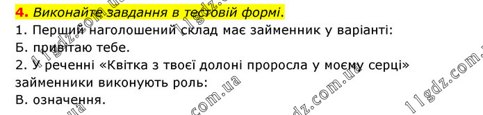 Виконайте завдання в тестовій формі. 1. Перший наголошений склад має займенник у варіанті: Б. привітаю тебе. 2. У реченні «Квітка з твоєї долоні проросла у моєму серці» займенники виконують роль: В. означення.