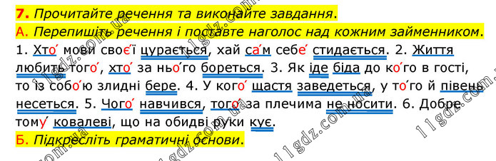 Прочитайте речення та виконайте завдання. А. Перепишіть речення і поставте наголос над кожним займенником. 1. Хто՛ мови своє՛ї цурається, хай са՛м себе՛ стидається. 2. Життя любить того՛, хто՛ за ньо՛го бореться. 3. Як іде біда до ко՛го в гості, то із собо՛ю злидні бере. 4. У кого՛ щастя заведеться, у то՛го й півень несеться. 5. Чого՛ навчився, того՛ за плечима не носити. 6. Добре тому՛ ковалеві, що на обидві руки кує. Б. Підкресліть граматичні основи.