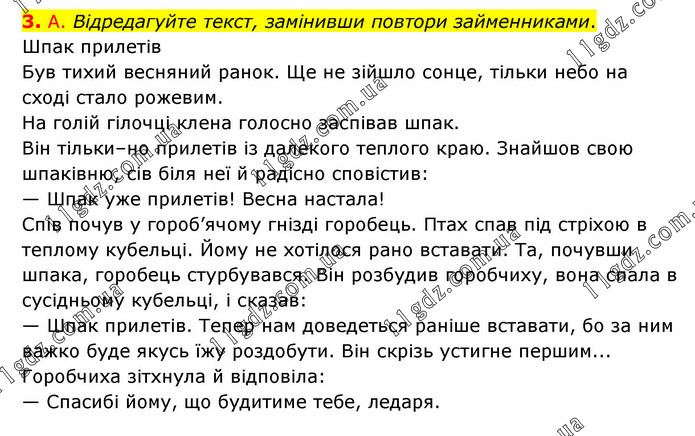 А. Відредагуйте текст, замінивши повтори займенниками. Шпак прилетів Був тихий весняний ранок. Ще не зійшло сонце, тільки небо на сході стало рожевим. На голій гілочці клена голосно заспівав шпак. Він тільки–но прилетів із далекого теплого краю. Знайшов свою шпаківню, сів біля неї й радісно сповістив: — Шпак уже прилетів! Весна настала! Спів почув у гороб’ячому гнізді горобець. Птах спав під стріхою в теплому кубельці. Йому не хотілося рано вставати. Та, почувши шпака, горобець стурбувався. Він розбудив горобчиху, вона спала в сусідньому кубельці, і сказав: — Шпак прилетів. Тепер нам доведеться раніше вставати, бо за ним важко буде якусь їжу роздобути. Він скрізь устигне першим... Горобчиха зітхнула й відповіла: — Спасибі йому, що будитиме тебе, ледаря.
