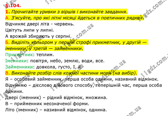 §.104. 1. Прочитайте уривки з віршів і виконайте завдання. A. З'ясуйте, про які літні місяці йдеться в поетичних рядках. Відчиняє двері літа - червень. Цвітуть липи у липні. А врожай збирають у серпні. Б. Виділіть кольором у першій строфі прикметник, у другій — іменники, у третій — займенники. Прикметник: теплим. Іменники: повітря, небо, землю, води, все. Займенники: довкола, густо, І, й. B. Виконайте розбір слів кожної частини мови (на вибір). Я – особовий займенник, перша особа однини, називний відмінок. Відчиняю – дієслово дійового способу, теперішній час, перша особа однини. Двері (іменник) – рідний відмінок, множина. В – прийменник неозначеної форми. Літо (іменник) – називний відмінок, однина.