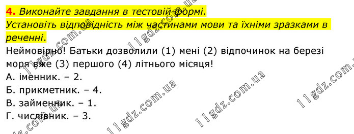 Виконайте завдання в тестовій формі. Установіть відповідність між частинами мови та їхніми зразками в реченні. Неймовірно! Батьки дозволили (1) мені (2) відпочинок на березі моря вже (3) першого (4) літнього місяця! А. іменник. – 2. Б. прикметник. – 4. В. займенник. – 1. Г. числівник. – 3.