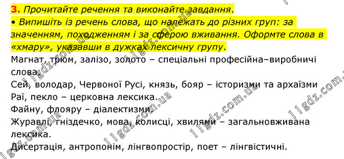 Прочитайте речення та виконайте завдання. • Випишіть із речень слова, що належать до різних груп: за значенням, походженням і за сферою вживання. Оформте слова в «хмару», указавши в дужках лексичну групу. Магнат, трюм, залізо, золото – спеціальні професійна–виробничі слова. Сей, володар, Червоної Русі, князь, бояр – історизми та архаїзми Раї, пекло – церковна лексика. Файну, флояру – діалектизми. Журавлі, гніздечко, мова, колисці, хвилями – загальновживана лексика. Дисертація, антропонім, лінгвопростір, поет – лінгвістичні.