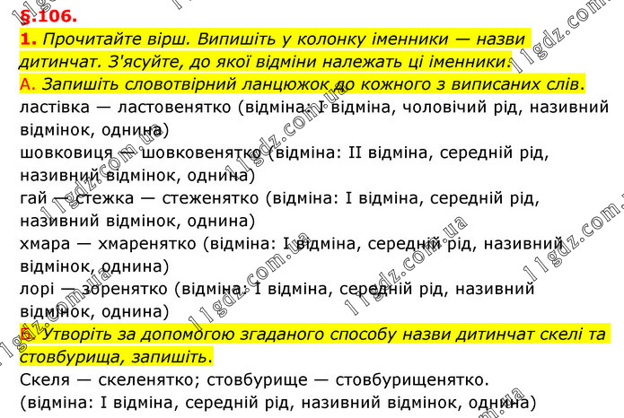 §.106. 1. Прочитайте вірш. Випишіть у колонку іменники — назви дитинчат. З'ясуйте, до якої відміни належать ці іменники. А. Запишіть словотвірний ланцюжок до кожного з виписаних слів. ластівка — ластовенятко (відміна: І відміна, чоловічий рід, називний відмінок, однина) шовковиця — шовковенятко (відміна: ІІ відміна, середній рід, називний відмінок, однина) гай — стежка — стеженятко (відміна: І відміна, середній рід, називний відмінок, однина) хмара — хмаренятко (відміна: І відміна, середній рід, називний відмінок, однина) лорі — зоренятко (відміна: І відміна, середній рід, називний відмінок, однина) Б. Утворіть за допомогою згаданого способу назви дитинчат скелі та стовбурища, запишіть. Скеля — скеленятко; стовбурище — стовбурищенятко. (відміна: І відміна, середній рід, називний відмінок, однина)