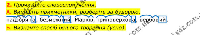 Прочитайте словосполучення. А. Випишіть прикметники, розберіть за будовою. надзоряна, безмежний, Марків, триповерхова, вербовий. Б. Визначте спосіб їхнього творення (усно).