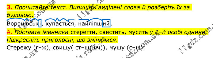 Прочитайте текст. Випишіть виділені слова й розберіть їх за будовою. Воронівські, купається, найліпший. А. Поставте іменники стерегти, свистить, мусить у 1–й особі однини. Підкресліть приголосні, що змінилися. Стережу (г–ж), свищу( ст–щ(шч)), мушу (с–ш).