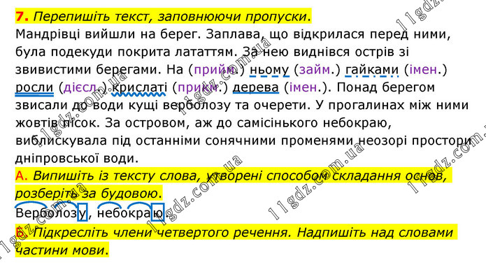 Перепишіть текст, заповнюючи пропуски. Мандрівці вийшли на берег. Заплава, що відкрилася перед ними, була подекуди покрита лататтям. За нею виднівся острів зі звивистими берегами. На (прийм.) ньому (займ.) гайками (імен.) росли (дієсл.) крислаті (прикм.) дерева (імен.). Понад берегом звисали до води кущі верболозу та очерети. У прогалинах між ними жовтів пісок. За островом, аж до самісінького небокраю, виблискувала під останніми сонячними променями неозорі простори дніпровської води. А. Випишіть із тексту слова, утворені способом складання основ, розберіть за будовою. Верболозу, небокраю. Б. Підкресліть члени четвертого речення. Надпишіть над словами частини мови.