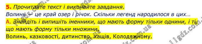 Прочитайте текст і виконайте завдання. Волинь — це край озер і річок. Скільки легенд народилося в цих… А. Знайдіть і випишіть іменники, що мають форму тільки однини, і ті, що мають форму тільки множини. Волинь, казковості, дитинство, хащів, Колодяжному.