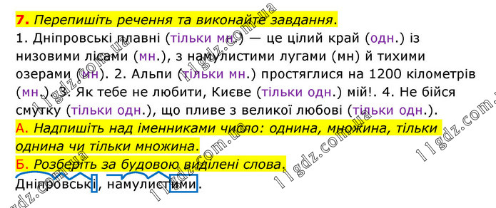 Перепишіть речення та виконайте завдання. 1. Дніпровські плавні (тільки мн.) — це цілий край (одн.) із низовими лісами (мн.), з намулистими лугами (мн) й тихими озерами (мн). 2. Альпи (тільки мн.) простяглися на 1200 кілометрів (мн.). 3. Як тебе не любити, Києве (тільки одн.) мій!. 4. Не бійся смутку (тільки одн.), що пливе з великої любові (тільки одн.). А. Надпишіть над іменниками число: однина, множина, тільки однина чи тільки множина. Б. Розберіть за будовою виділені слова. Дніпровські, намулистими.
