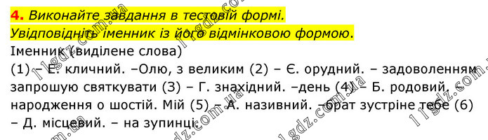 Виконайте завдання в тестовій формі. Увідповідніть іменник із його відмінковою формою. Іменник (виділене слова) (1) – Е. кличний. –Олю, з великим (2) – Є. орудний. – задоволенням запрошую святкувати (З) – Г. знахідний. –день (4) – Б. родовий. – народження о шостій. Мій (5) – А. називний. –брат зустріне тебе (6) – Д. місцевий. – на зупинці.