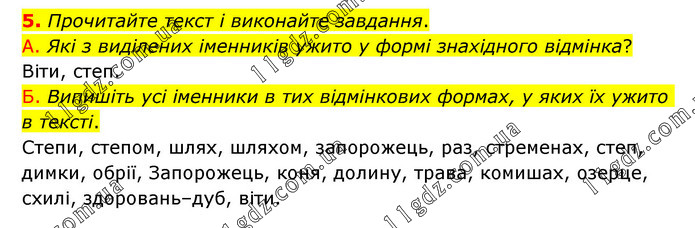 Прочитайте текст і виконайте завдання. A. Які з виділених іменників ужито у формі знахідного відмінка? Віти, степ. Б. Випишіть усі іменники в тих відмінкових формах, у яких їх ужито в тексті. Степи, степом, шлях, шляхом, запорожець, раз, стременах, степ, димки, обрії, Запорожець, коня, долину, трава, комишах, озерце, схилі, здоровань–дуб, віти.
