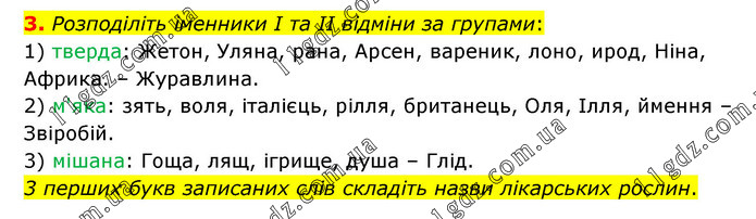 Розподіліть іменники І та II відміни за групами: 1) тверда: Жетон, Уляна, рана, Арсен, вареник, лоно, ирод, Ніна, Африка. – Журавлина. 2) м'яка: зять, воля, італієць, рілля, британець, Оля, Ілля, ймення – Звіробій. 3) мішана: Гоща, лящ, ігрище, душа – Глід. 3 перших букв записаних слів складіть назви лікарських рослин.