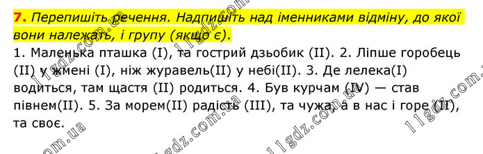 Перепишіть речення. Надпишіть над іменниками відміну, до якої вони належать, і групу (якщо є). 1. Маленька пташка (I), та гострий дзьобик (II). 2. Ліпше горобець (II) у жмені (I), ніж журавель(II) у небі(II). 3. Де лелека(I) водиться, там щастя (II) родиться. 4. Був курчам (IV) — став півнем(II). 5. За морем(II) радість (III), та чужа, а в нас і горе (II), та своє.