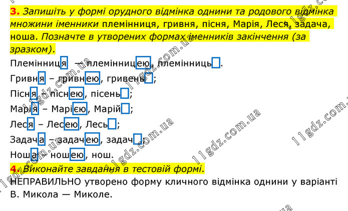 3. Запишіть у формі орудного відмінка однини та родового відмінка множини іменники племінниця, гривня, пісня, Марія, Леся, задача, ноша. Позначте в утворених формах іменників закінчення (за зразком). Племінниця — племінницею, племінниць . Гривня – гривнею, гривень ; Пісня – піснею, пісень ; Марія – Марією, Марій ; Леся – Лесею, Лесь ; Задача – задачею, задач ; Ноша – ношею, нош. 4. Виконайте завдання в тестовій формі. НЕПРАВИЛЬНО утворено форму кличного відмінка однини у варіанті В. Микола — Миколе.