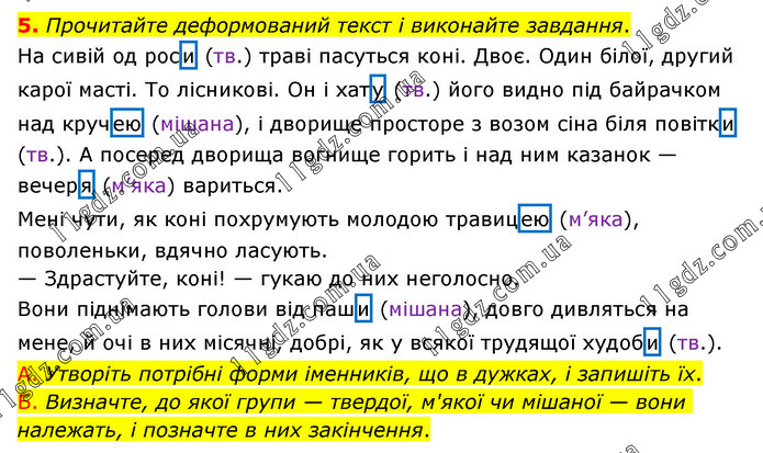 Прочитайте деформований текст і виконайте завдання. На сивій од роси (тв.) траві пасуться коні. Двоє. Один білої, другий карої масті. То лісникові. Он і хату (тв.) його видно під байрачком над кручею (мішана), і дворище просторе з возом сіна біля повітки (тв.). А посеред дворища вогнище горить і над ним казанок — вечеря (м’яка) вариться. Мені чути, як коні похрумують молодою травицею (м’яка), поволеньки, вдячно ласують. — Здрастуйте, коні! — гукаю до них неголосно. Вони піднімають голови від паши (мішана), довго дивляться на мене, й очі в них місячні, добрі, як у всякої трудящої худоби (тв.). A. Утворіть потрібні форми іменників, що в дужках, і запишіть їх. Б. Визначте, до якої групи — твердої, м'якої чи мішаної — вони належать, і позначте в них закінчення.