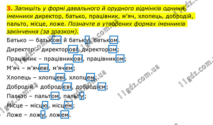 Запишіть у формі давального й орудного відмінків однини іменники директор, батько, працівник, м’яч, хлопець, добродій, пальто, місце, ложе. Позначте в утворених формах іменників закінчення (за зразком). Батько — батькові й батьку, батьком. Директор – директорові, директором; Працівник – працівникові, працівником; М’яч – м’ячеві, м’ячем; Хлопець – хлопцеві, хлопцем; Добродій – добродієві, добродієм; Пальто – пальтом, пальту; Місце – місцю, місцем; Ложе – ложу, ложем.