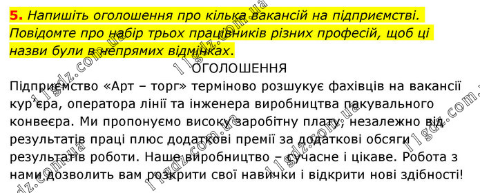 Напишіть оголошення про кілька вакансій на підприємстві. Повідомте про набір трьох працівників різних професій, щоб ці назви були в непрямих відмінках. ОГОЛОШЕННЯ Підприємство «Арт – торг» терміново розшукує фахівців на вакансії кур’єра, оператора лінії та інженера виробництва пакувального конвеєра. Ми пропонуємо високу заробітну плату, незалежно від результатів праці плюс додаткові премії за додаткові обсяги результатів роботи. Наше виробництво – сучасне і цікаве. Робота з нами дозволить вам розкрити свої навички і відкрити нові здібності!