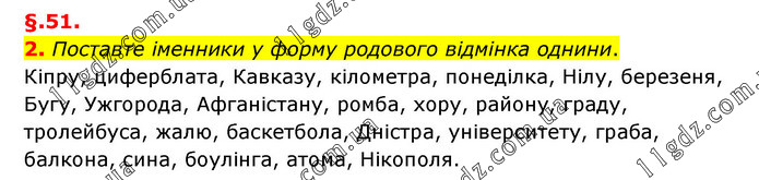 §.51. 2. Поставте іменники у форму родового відмінка однини. Кіпру, циферблата, Кавказу, кілометра, понеділка, Нілу, березеня, Бугу, Ужгорода, Афганістану, ромба, хору, району, граду, тролейбуса, жалю, баскетбола, Дністра, університету, граба, балкона, сина, боулінга, атома, Нікополя.