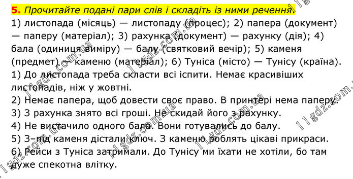 Прочитайте подані пари слів і складіть із ними речення. 1) листопада (місяць) — листопаду (процес); 2) папера (документ) — паперу (матеріал); 3) рахунка (документ) — рахунку (дія); 4) бала (одиниця виміру) — балу (святковий вечір); 5) каменя (предмет) — каменю (матеріал); 6) Туніса (місто) — Тунісу (країна). 1) До листопада треба скласти всі іспити. Немає красивіших листопадів, ніж у жовтні. 2) Немає папера, щоб довести своє право. В принтері нема паперу. 3) З рахунка знято всі гроші. Не скидай його з рахунку. 4) Не вистачило одного бала. Вони готувались до балу. 5) З–під каменя дістали ключ. З каменю роблять цікаві прикраси. 6) Рейси з Туніса затримали. До Тунісу ми їхати не хотіли, бо там дуже спекотна влітку.