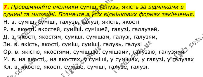 Провідміняйте іменники суміш, галузь, якість за відмінками в однині та множині. Позначте в усіх відмінкових формах закінчення. Н. в. суміш, суміші, галузь, галузі, якість, якості Р. в. якості, якостей, суміші, сумішей, галузі, галлузей, Д. в. якості, якостям, суміші, сумішам, галузі, галузям, Зн. в. якість, якості, суміш, суміші, галузь, галузі Ор. в. якістю, якостями, сумішшю, сумішами, галуззю, галузями М. в. на якості,, на якостях, у суміші, у сумішах, у галузі, у галузях Кл. в. якосте, якості, суміше, суміші, галузе, галузі.