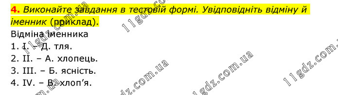 Виконайте завдання в тестовій формі. Увідповідніть відміну й іменник (приклад). Відміна іменника 1. І. – Д. тля. 2. II. – А. хлопець. 3. III. – Б. ясність. 4. IV. – В. хлоп’я.