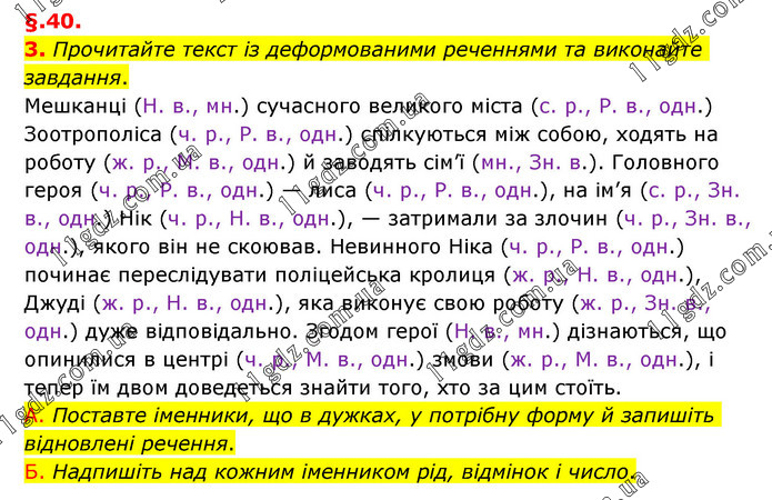 §.40. 3. Прочитайте текст із деформованими реченнями та виконайте завдання. Мешканці (Н. в., мн.) сучасного великого міста (с. р., Р. в., одн.) Зоотрополіса (ч. р., Р. в., одн.) спілкуються між собою, ходять на роботу (ж. р., М. в., одн.) й заводять сім’ї (мн., Зн. в.). Головного героя (ч. р., Р. в., одн.) — лиса (ч. р., Р. в., одн.), на ім’я (с. р., Зн. в., одн.) Нік (ч. р., Н. в., одн.), — затримали за злочин (ч. р., Зн. в., одн.), якого він не скоював. Невинного Ніка (ч. р., Р. в., одн.) починає переслідувати поліцейська кролиця (ж. р., Н. в., одн.), Джуді (ж. р., Н. в., одн.), яка виконує свою роботу (ж. р., Зн. в., одн.) дуже відповідально. Згодом герої (Н. в., мн.) дізнаються, що опинилися в центрі (ч. р., М. в., одн.) змови (ж. р., М. в., одн.), і тепер їм двом доведеться знайти того, хто за цим стоїть. А. Поставте іменники, що в дужках, у потрібну форму й запишіть відновлені речення. Б. Надпишіть над кожним іменником рід, відмінок і число.