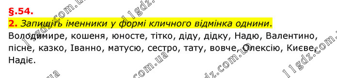 §.54. 2. Запишіть іменники у формі кличного відмінка однини. Володимире, кошеня, юносте, тітко, діду, дідку, Надю, Валентино, пісне, казко, Іванно, матусю, сестро, тату, вовче, Олексію, Києве, Надіє.