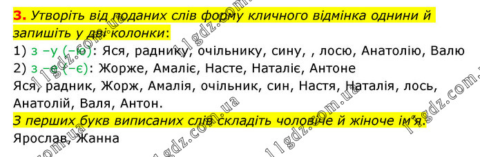 Утворіть від поданих слів форму кличного відмінка однини й запишіть у дві колонки: 1) з –у (–ю): Яся, раднику, очільнику, сину, , лосю, Анатолію, Валю 2) з –е (–є): Жорже, Амаліє, Насте, Наталіє, Антоне Яся, радник, Жорж, Амалія, очільник, син, Настя, Наталія, лось, Анатолій, Валя, Антон. З перших букв виписаних слів складіть чоловіче й жіноче ім’я. Ярослав, Жанна