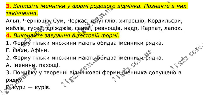 3. Запишіть іменники у формі родового відмінка. Позначте в них закінчення. Альп, Чернівців, Сум, Черкас, джунглів, хитрощів, Кордильєри, меблів, гусей, дріжджів, саней, ревнощів, надр, Карпат, лапок. 4. Виконайте завдання в тестовій формі. 1. Форму тільки множини мають обидва іменники рядка. Г. шахи, Афіни. 2. Форму тільки множини мають обидва іменники рядка. А. іменини, пахощі. 3. Помилку у творенні відмінкової форми іменника допущено в рядку. Г. кури — курів.