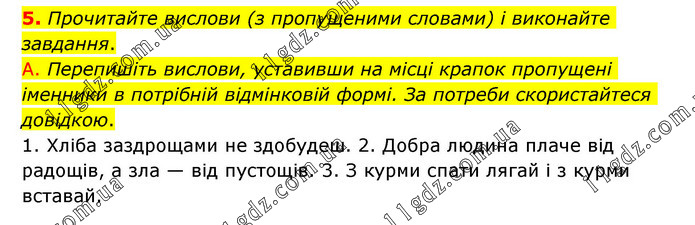 5. Прочитайте вислови (з пропущеними словами) і виконайте завдання. А. Перепишіть вислови, уставивши на місці крапок пропущені іменники в потрібній відмінковій формі. За потреби скористайтеся довідкою. 1. Хліба заздрощами не здобудеш. 2. Добра людина плаче від радощів, а зла — від пустощів. 3. З курми спати лягай і з курми вставай.