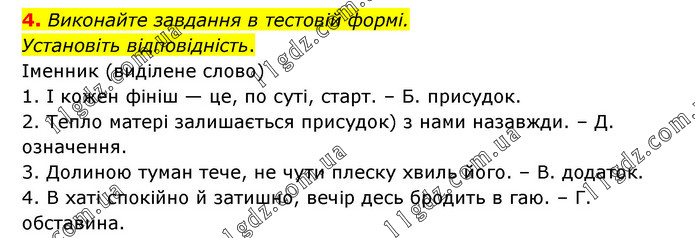 Виконайте завдання в тестовій формі. Установіть відповідність. Іменник (виділене слово) 1. І кожен фініш — це, по суті, старт. – Б. присудок. 2. Тепло матері залишається присудок) з нами назавжди. – Д. означення. 3. Долиною туман тече, не чути плеску хвиль його. – В. додаток. 4. В хаті спокійно й затишно, вечір десь бродить в гаю. – Г. обставина.